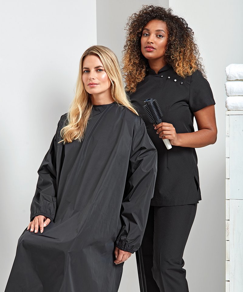 Waterproof and bleach resistant for use in salons and barbers. Elasticated cuffs. Adjustable tear release fastening. Measures 108cm long. BSCI certified. Reach certified. SEDEX certified. WRAP certified.